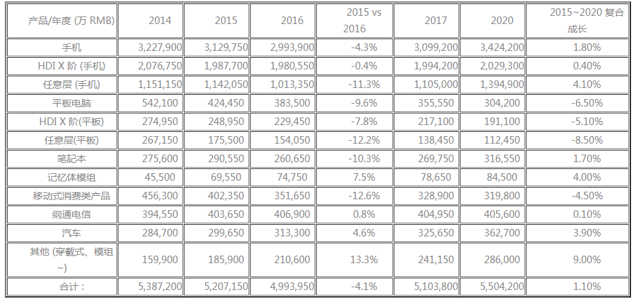 順應電子產品輕薄化、多功能化、一體化的發展趨勢,PCB持續向高精密、高集成和輕薄化方向發展,隨著手持式、便攜式電子產品的尺寸不斷縮小,對作為電子產品載體的印制電路板精細化要求也是逐年提升,高端HDI產品在手機、數碼產品、通訊網絡、車載等電子產品領域,需求占有量不斷提升,其中通訊網絡與手機為最大應用領域,在市場表現尤為突出!